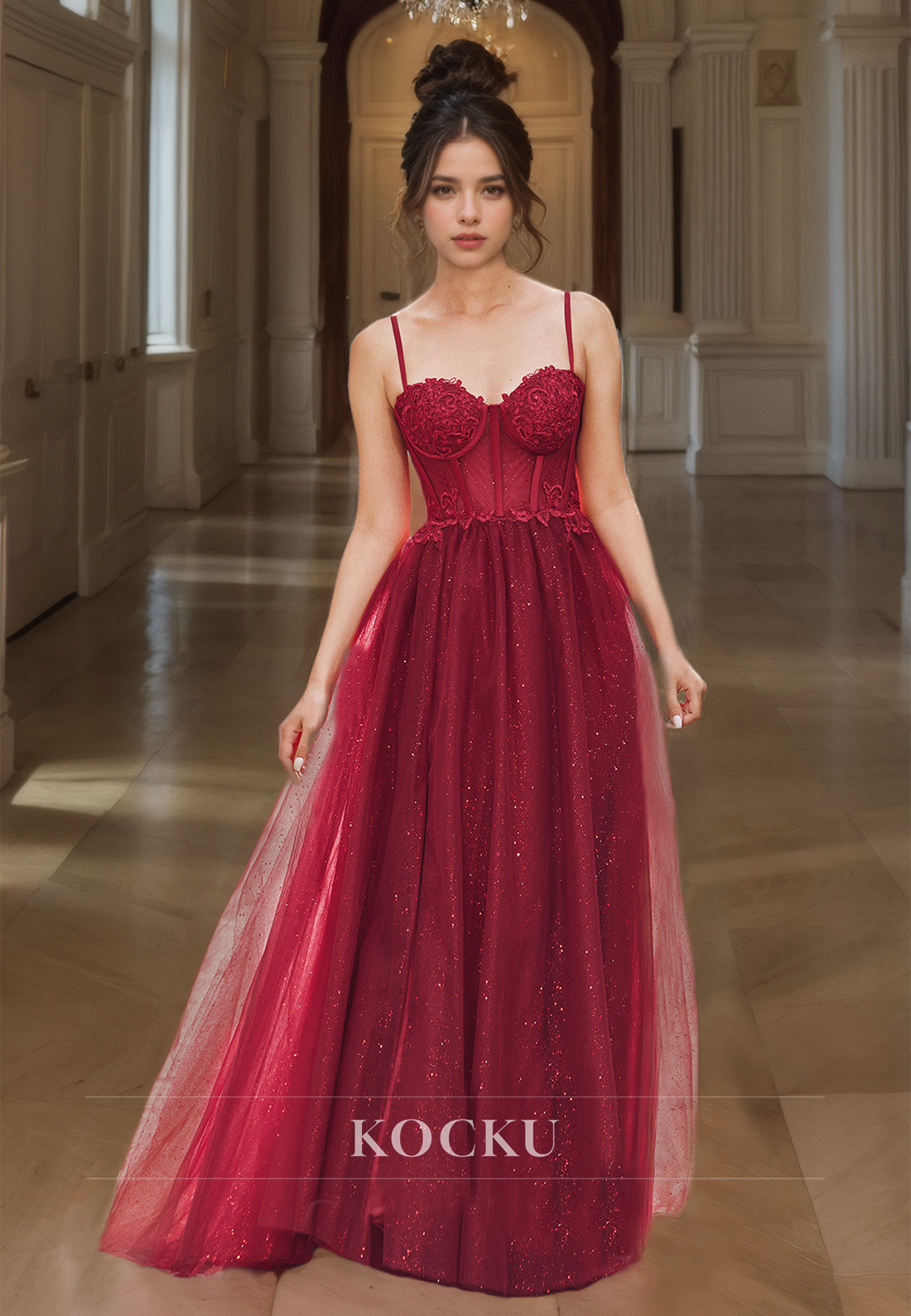 A-Line Spaghetti Straps Sweetheart Prom Dress Floor-Length Glitter Knit Party Dress with Appliques