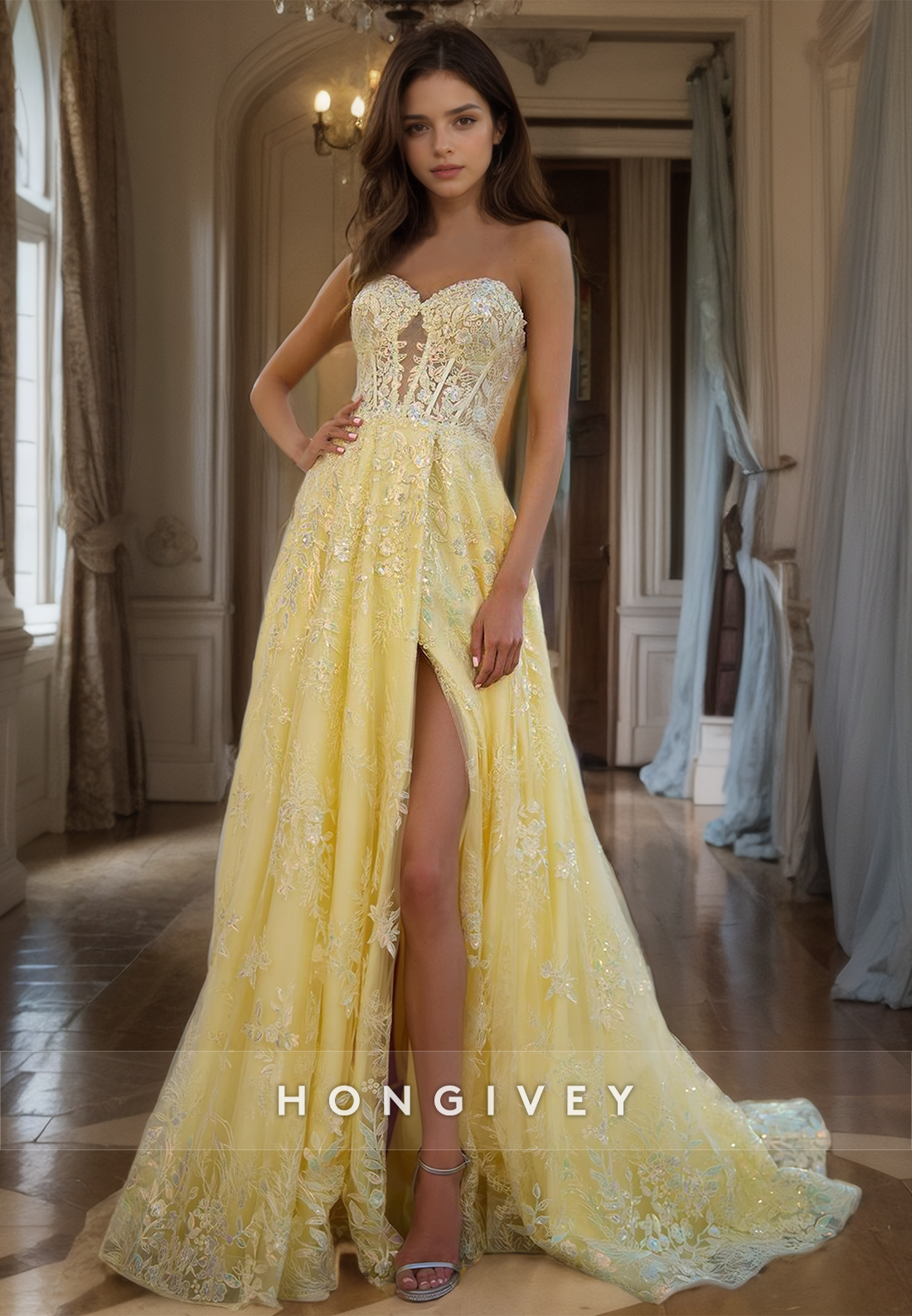 Elegant Sweetheart Lace Floor Length Prom Dress Strapless A-Line Formal Cocktail Dress with High Split