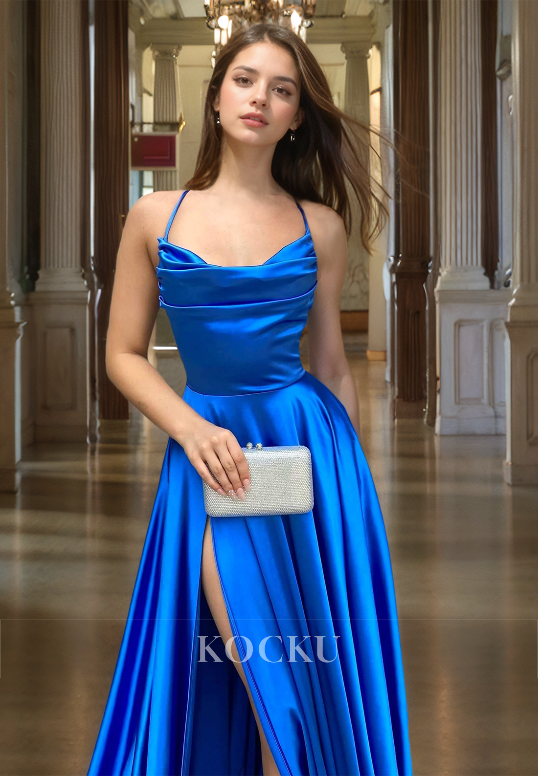 A-Line Spaghetti Straps Sweetheart Sleeveless Slit Pleats Satin Party Gown with Train Prom Dress