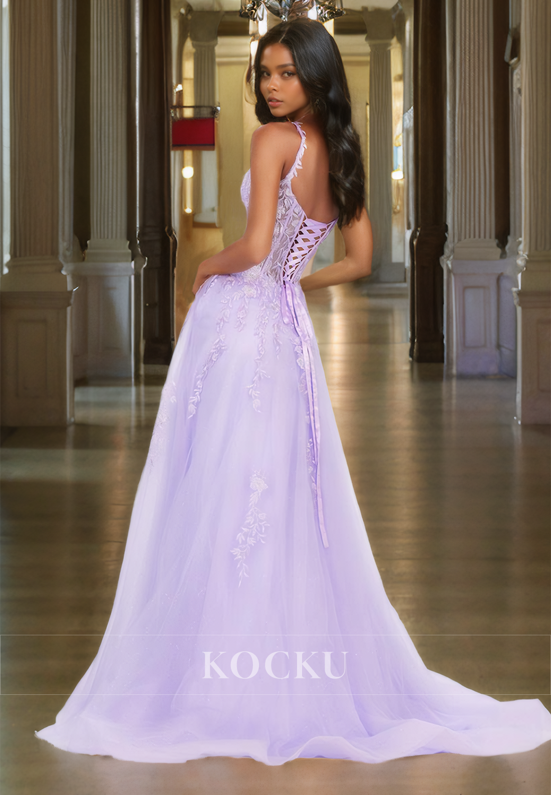 A-Line Spaghetti Straps V-Neck Prom Dress Sleeveless Stripe Train Lace Evening Dress with Appliques