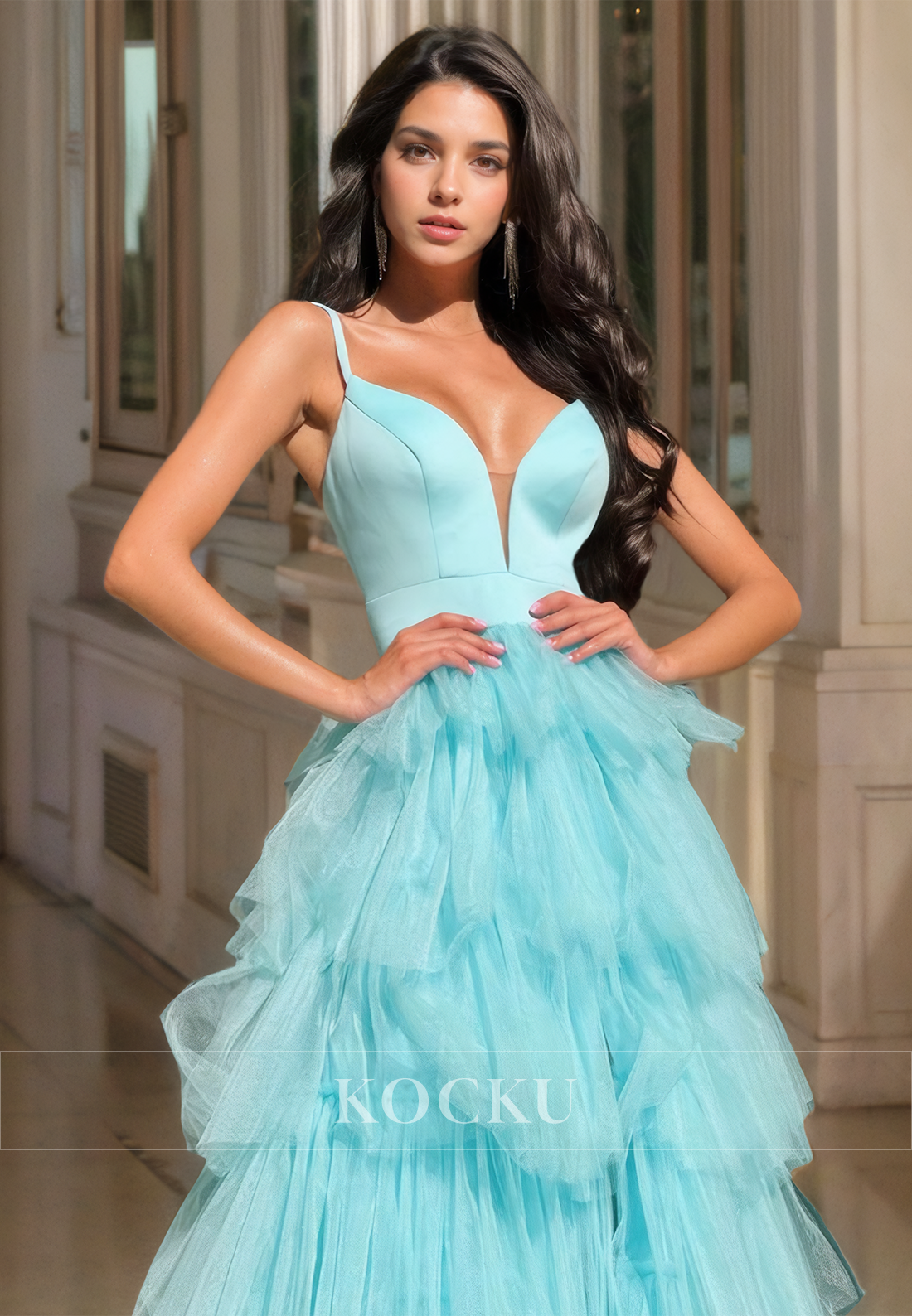 A-Line Spaghetti Straps V-Neck Prom Dress Sleeveless Floor-Length Lace Party Dress with Slit