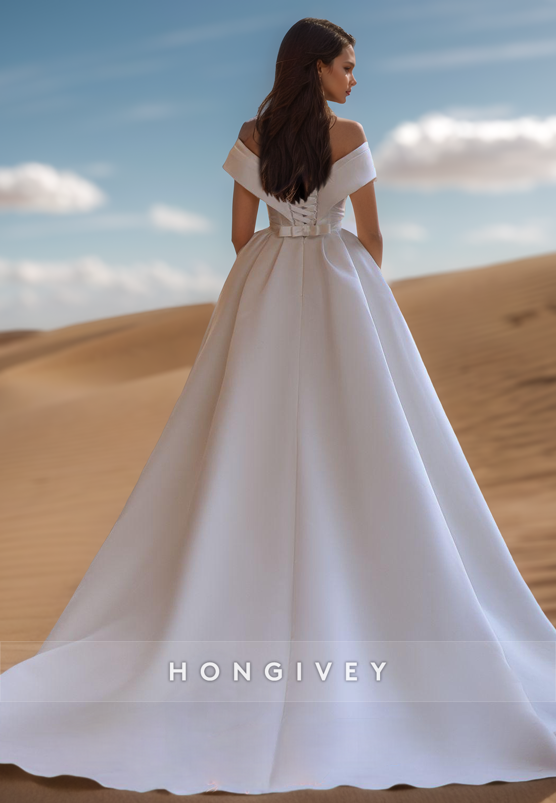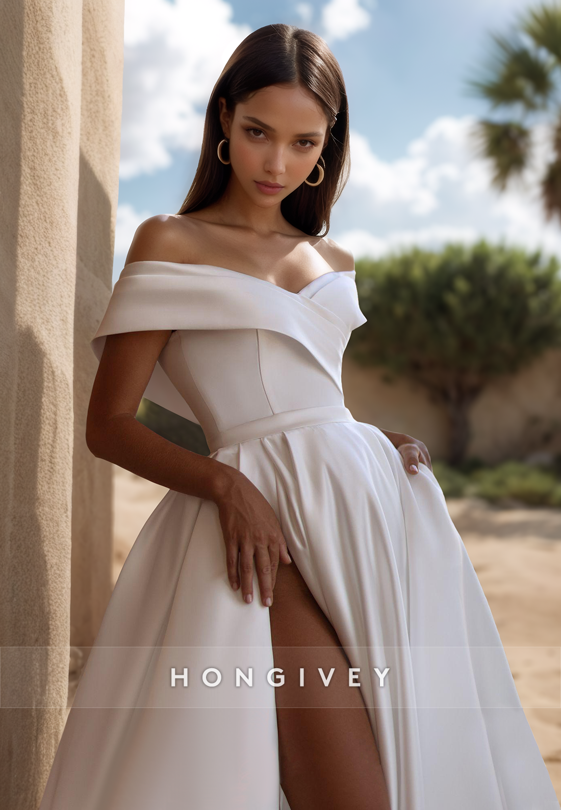 Elegant Off Shoulder Corset A- Line with Slit Satin Wedding Dress Bride Gown