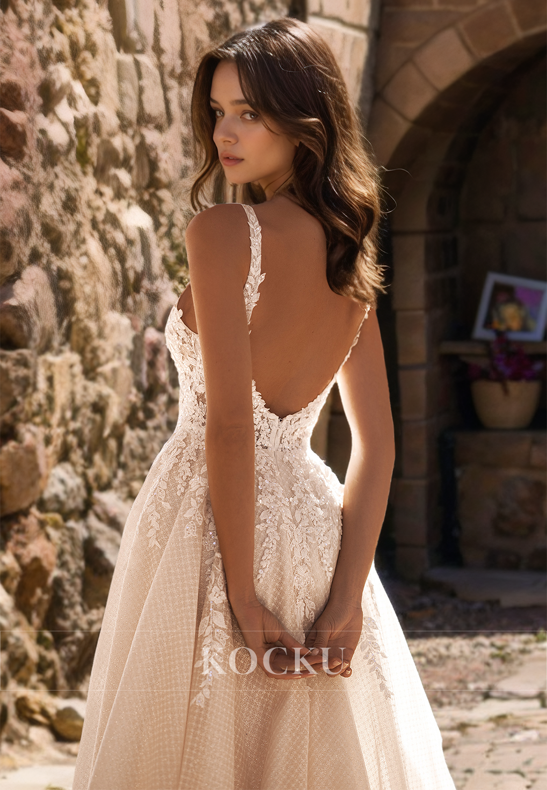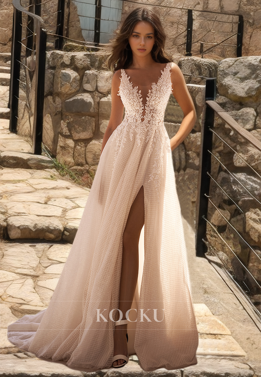 Expertly crafted for a flawless fit, this A-line wedding dress features delicate spaghetti straps, a feminine v-neckline, and a flattering high slit train. The stunning tulle fabric is adorned with intricate appliques, adding a touch of elegance to this timeless bridal gown. Perfect for the modern bride looking for both style and comfort on her special day.