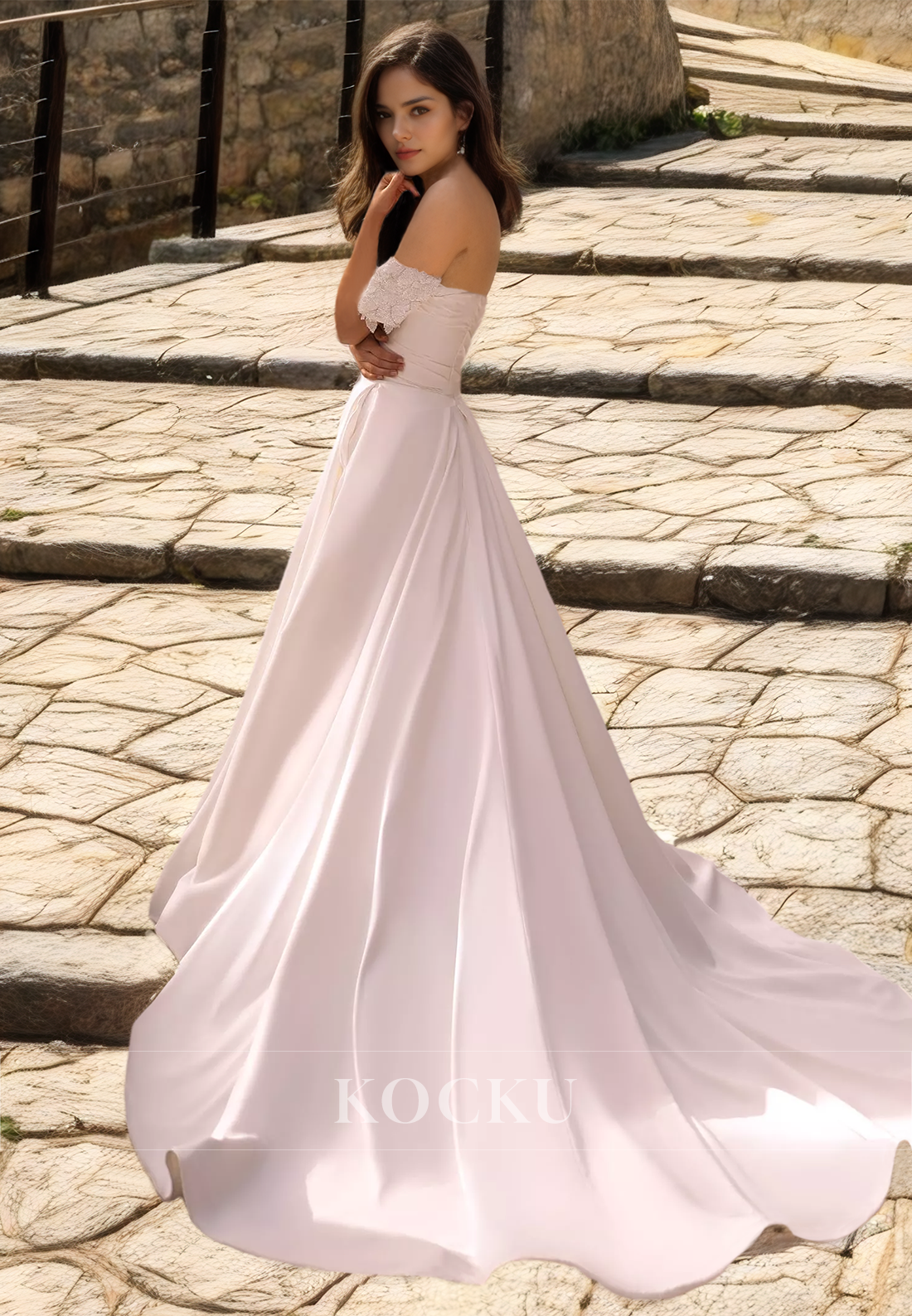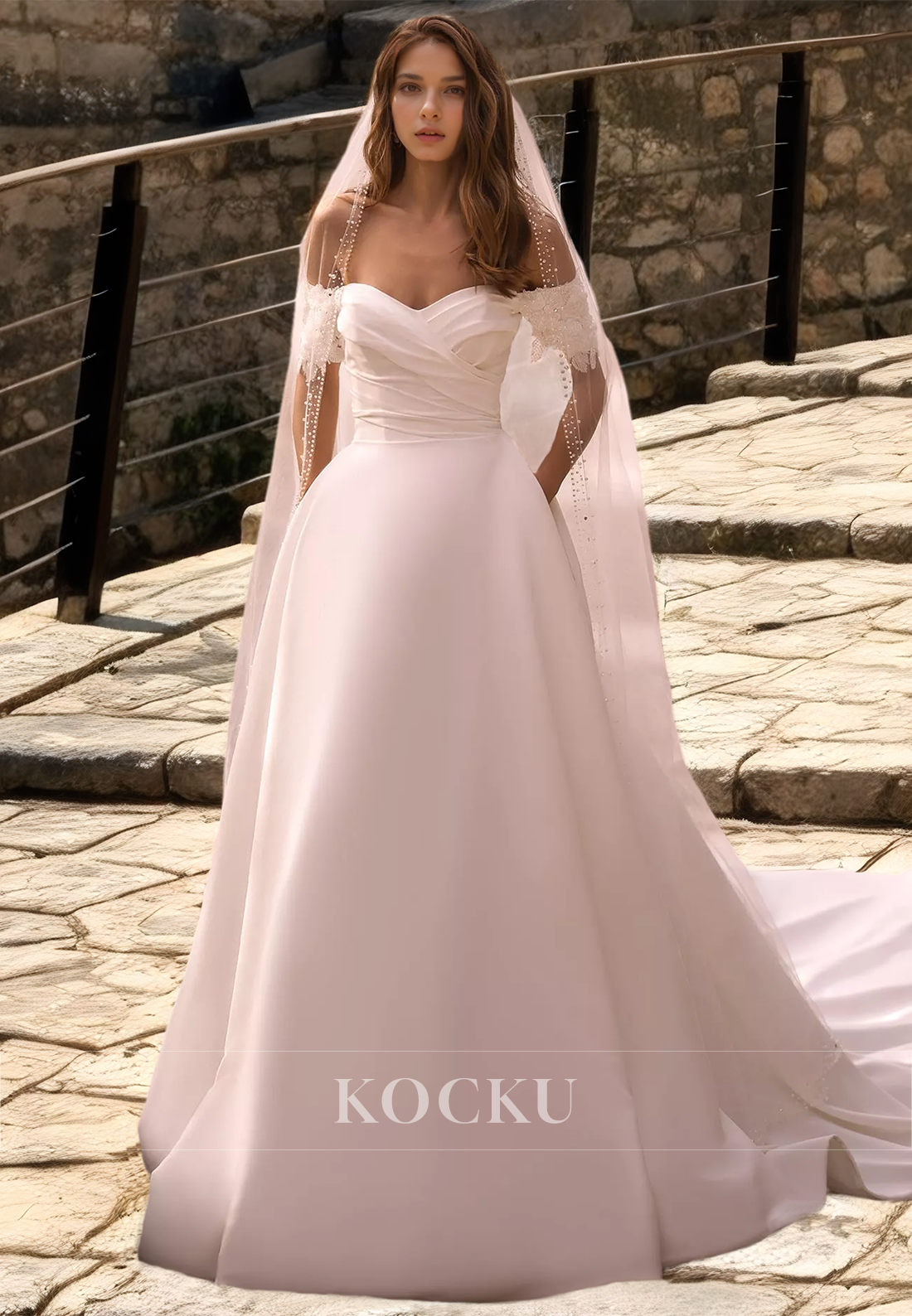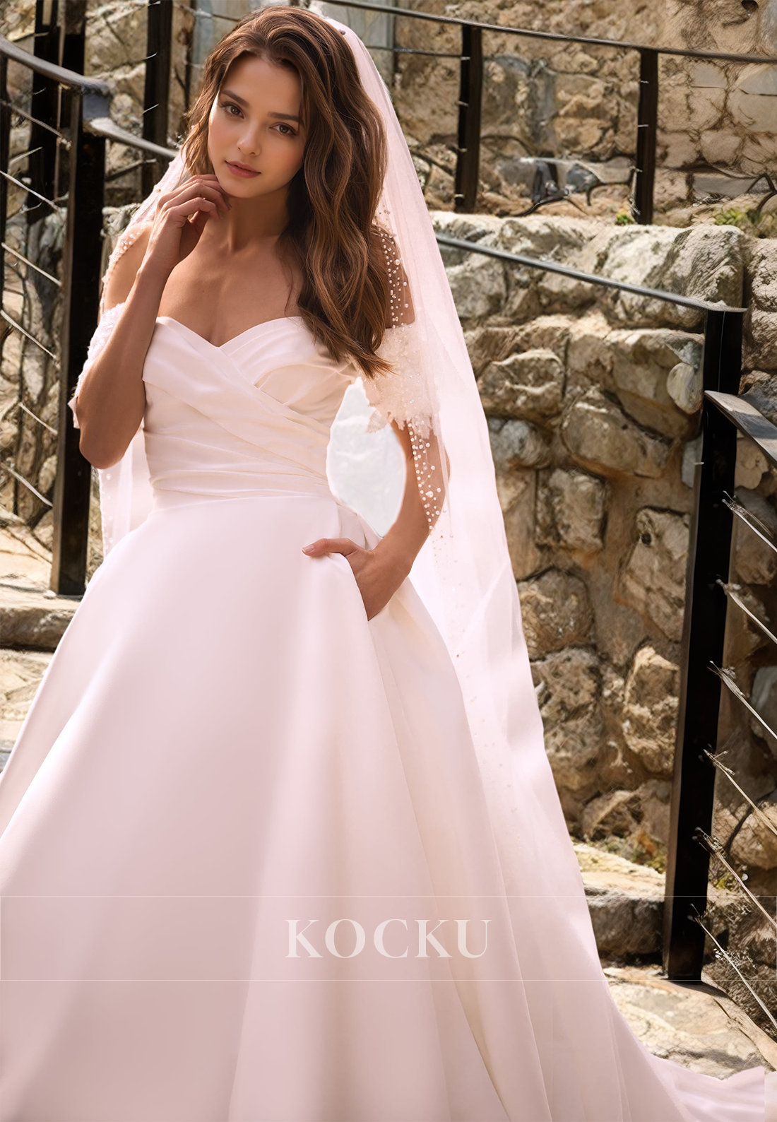 A-Line Sweetheart Sleeveless Train Ruched Appliques Satin Bridal Gowns Wedding Dress with Pocket