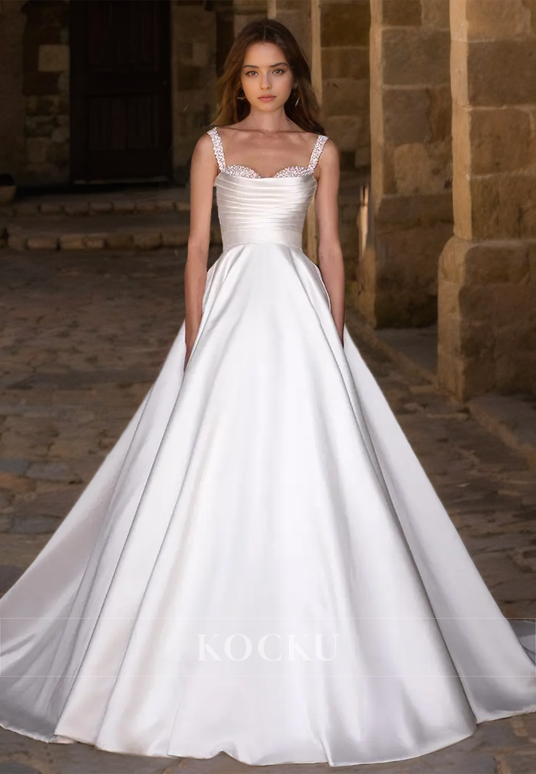 A-Line Sweetheart Straps Sleeveless Beads Ruched Satin Wedding Dress with Train Bridal Gowns