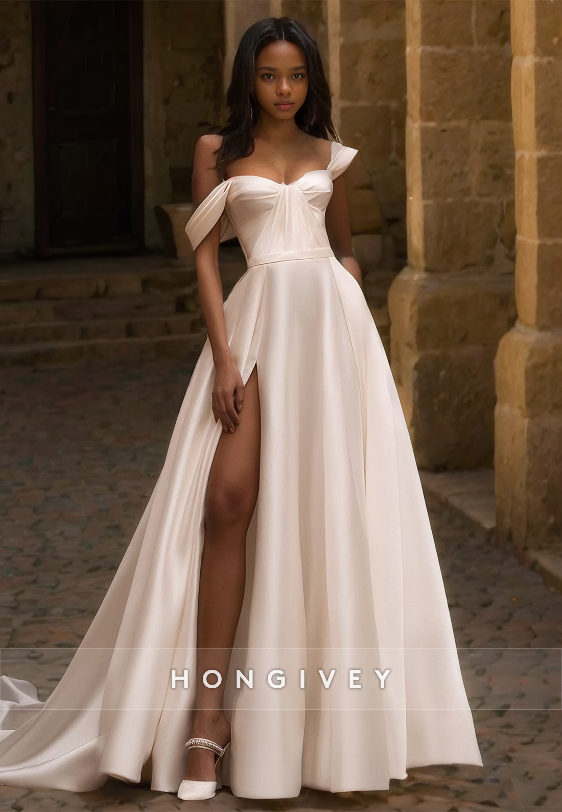 Sexy Satin A-Line Off-Shoulder Empire With Side Slit Train Wedding Dress